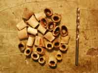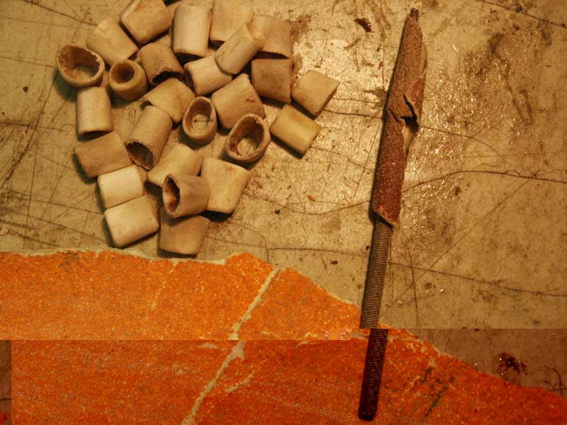 rough and the outside covered by some meaty, fleshy, fatty, stuff. For this take out your emery paper. Smoothen the ends by holding the pieces and then pulling them over the emery paper. This will also deal with those "teeth" mentioned earlier. Next smoothen the edges of the ends by pulling them over the emery paper again while rotating. This will make them round. Now work on the outside. Smoothen, smoothen, smoothen.... And finally wind some emery paper around the file or a drill and keep working on the inside. |